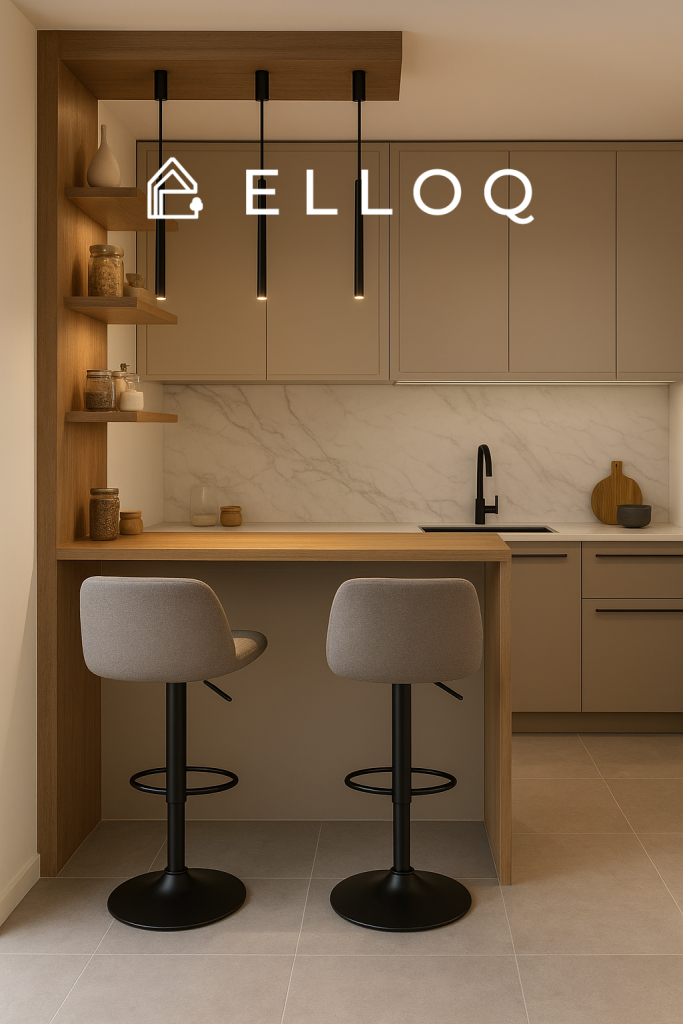Alih-alih menggunakan tembok permanen yang mungkin akan membatasi sirkulasi udara hingga pencahayaan, akan lebih baik membiarkan dapur kecil terbuka. Dengan konsep open space ada lebih banyak kemungkinan yang bisa dilakukan. Salah satunya adalah membawa masuk meja bar dapur kecil yang multifungsi, atau setidaknya berfungsi ganda sebagai pembatas ruangan.