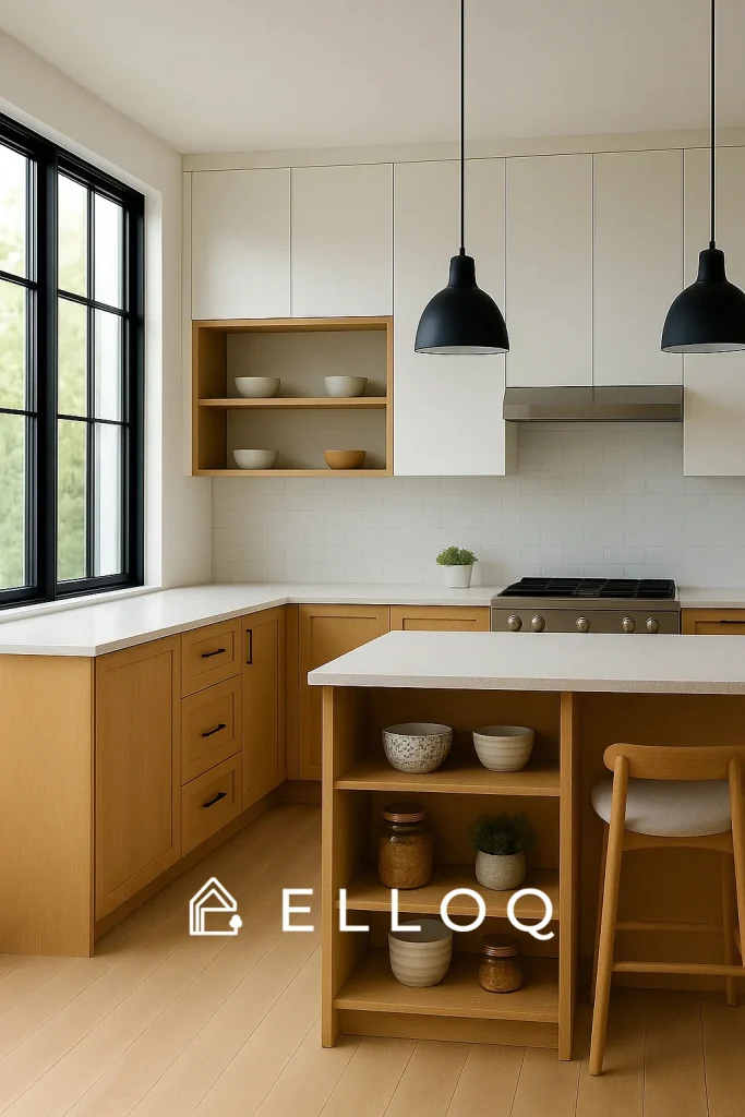 Penyimpanan tertutup mungkin essensials di dapur minimalis, tapi bukan berarti kita harus menghindari penyimpanan terbuka. Gunakan itu secara cerdas untuk pernak pernik dekoratif sehingga ada lebih banyak titik fokus yang mengundang.